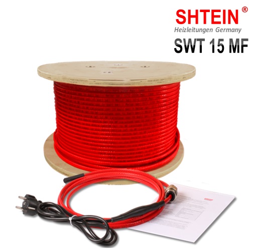 В целях предотвращения электромагнитного излучения в кабелях SHTEIN SWT-15 MF применяется защита в виде луженого медного экрана по всей длине кабеля. Готовый комплект состоит из саморегулирующегося кабеля длиной 10 метров и присоединенного к нему кабеля питания с вилкой длиной 1,5 метра. Соединение кабелей и концевая заглушка выполнены из герметичого термостойкого материла.