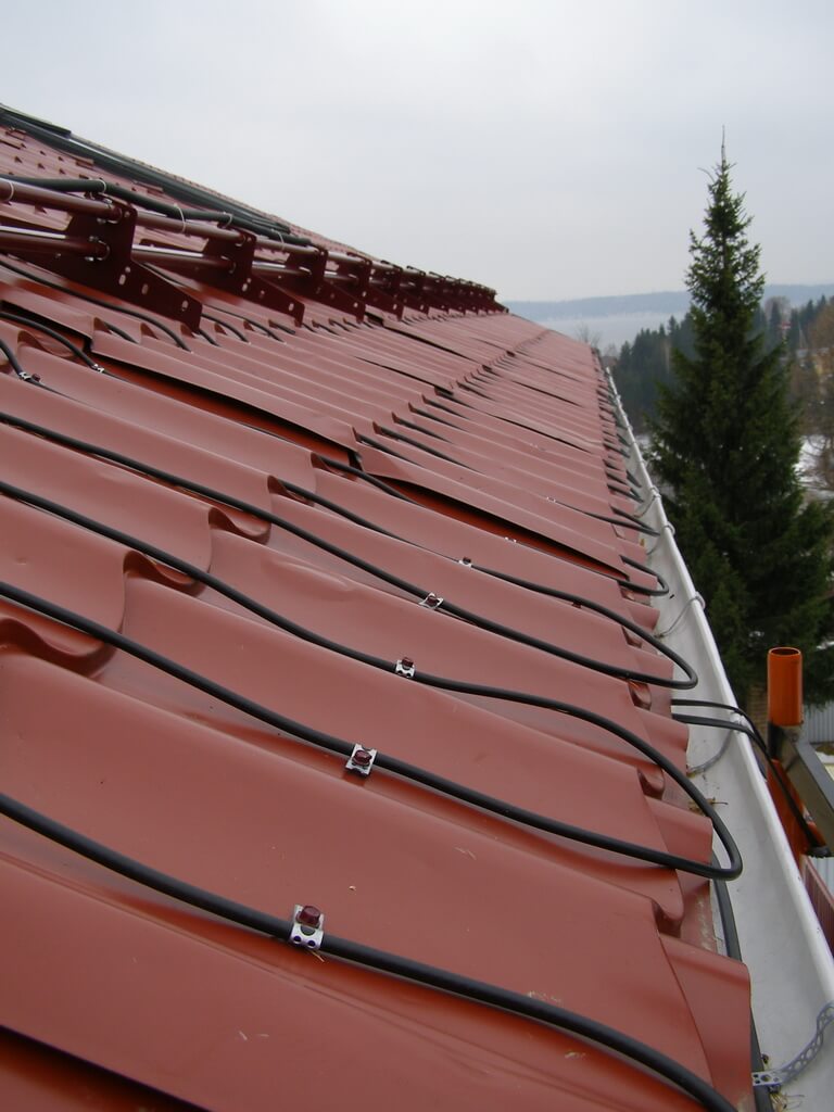 Нагревательный кабель Raychem GM-2CW разработан специально для борьбы со скоплением снега и льда на кровле, желобах, водостоках и отливах, выполненных из стандартных материалов, не горючих и не распространяющих горение. Кабель размещается по периметру кровли. Площадь обогрева должна составлять 30-50 см края кровли. Кабель укладывается равными шагами и фиксируется на поверхности. Укладка кабеля в желобах и отливах производится в несколько рядов. Особое внимание следует уделить зоне соединения отлива и водостока. Внутрь водостока также опускается кабель в два ряда и фиксируется в нижней части трубы петлей из кабеля. Важно помнить, что при прокладке по битуму, рубероиду и т.п. необходимо использовать греющий кабель в оболочке из фторполимера.