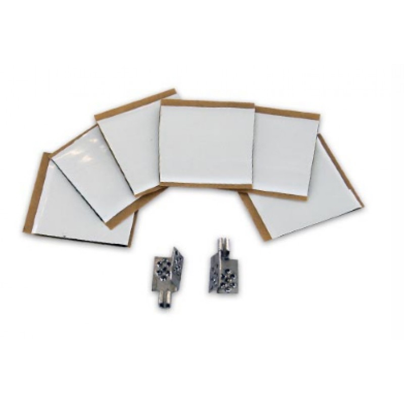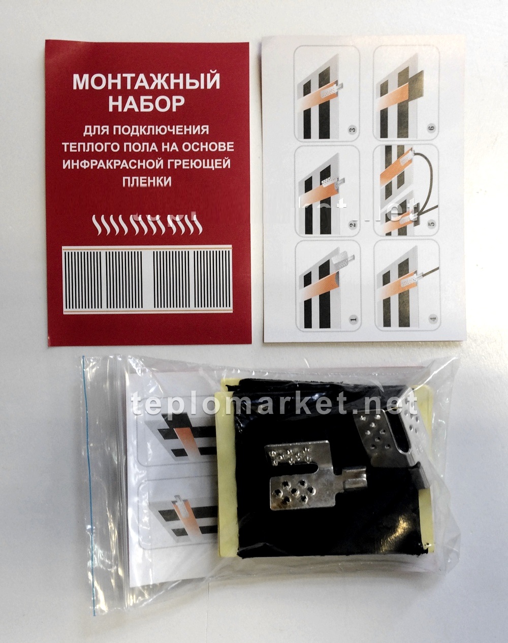 Монтажный набор для инфракрасной пленки применяется для подключения силового кабеля (электропитания) к одной нагревательной секции инфракрасного теплого пола. Используется для быстрого монтажа систем инфракрасного обогрева и обеспечивает хороший контакт и надежную изоляцию. Монтажный набор включает в себя два контактных зажима (люверса) и шесть изоляционных накладок на битумной основе с добавлением бутилкаучука. Такой набор рассчитан на подключение двух медных шин с изоляцией мест соединения инфракрасной пленки.