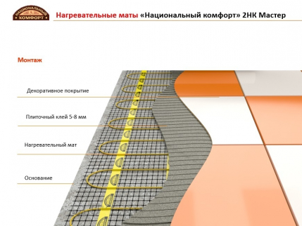 Комплект теплого пола НАЦИОНАЛЬНЫЙ КОМФОРТ 2НК "МАСТЕР" представляет собой набор включающий в себя терморегуляр и тонкий нагревательный мат высокой надежности, где в качестве греющего элемента выступает двухжильный резистивный кабель, покрытый двойной изоляцией из поливинилхлорида. Греющий кабель имеет диаметр 4,5 мм, а высота мата не превышает 5 мм. Удельная мощность тепловыделения составляет 150 Вт/кв.м. Нагревательный кабель закреплен на специальной монтажной стеклосетке с шагом укладки, исключающим возможность фрагментарного перегрева греющего элемента.