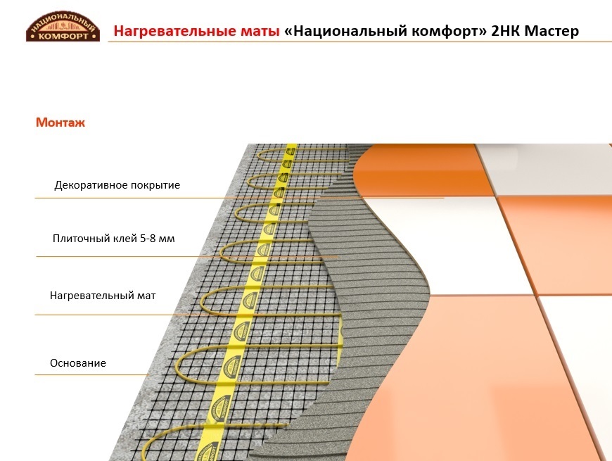 Комплект теплого пола НАЦИОНАЛЬНЫЙ КОМФОРТ 2НК "МАСТЕР" представляет собой набор включающий в себя терморегуляр и тонкий нагревательный мат высокой надежности, где в качестве греющего элемента выступает двухжильный резистивный кабель, покрытый двойной изоляцией из поливинилхлорида. Греющий кабель имеет диаметр 4,5 мм, а высота мата не превышает 5 мм. Удельная мощность тепловыделения составляет 150 Вт/кв.м. Нагревательный кабель закреплен на специальной монтажной стеклосетке с шагом укладки, исключающим возможность фрагментарного перегрева греющего элемента.