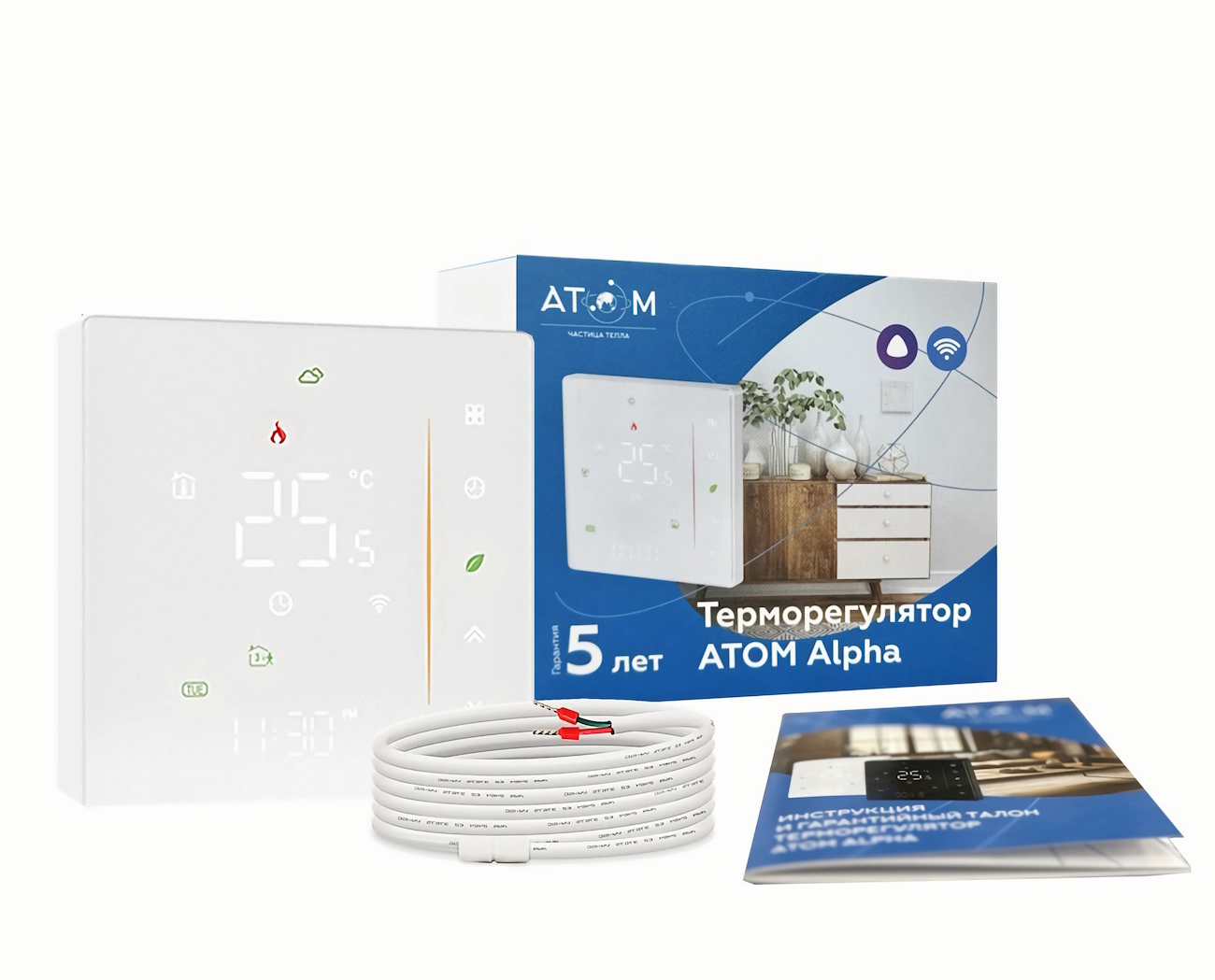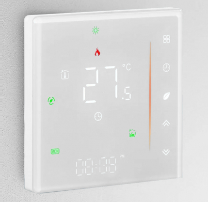 ATOM Alpha Wi-Fi совместим с операционными системами: IOS и Android. Поддерживает приложения Smart Life, Beca Smart, Tuya Smart и другие. Простая интеграция в системы “Умный Дом”. Программировать терморегулятор ATOM Alpha Wi-Fi можно на каждый день и неделю, используя шесть временных интервалов. Функция недельного программирования даёт возможность разделить сутки на шесть периодов и автоматически поддерживать различную температуру в каждом периоде. В терморегуляторе имеется независимый элемент питания для сохранения настроек. После отключения и включения электропитания терморегулятор автоматически включится в режим работы подогрева теплого пола, который был ранее задан пользователем.