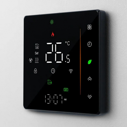ATOM Alpha Wi-Fi совместим с операционными системами: IOS и Android. Поддерживает приложения Smart Life, Beca Smart, Tuya Smart и другие. Простая интеграция в системы “Умный Дом”. Программировать терморегулятор ATOM Alpha Wi-Fi можно на каждый день и неделю, используя шесть временных интервалов. Функция недельного программирования даёт возможность разделить сутки на шесть периодов и автоматически поддерживать различную температуру в каждом периоде. В терморегуляторе имеется независимый элемент питания для сохранения настроек. После отключения и включения электропитания терморегулятор автоматически включится в режим работы подогрева теплого пола, который был ранее задан пользователем.