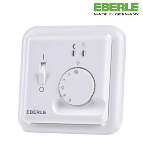 Терморегулятор EBERLE FRe 525 22 это электрическое устройство, с механическим регулятором температур, которое предназначено для контроля за работой теплого пола в обогреваемом помещении. Терморегулятор EBERLE FRe 525 22 имеет стандартные размеры для монтажа во встраиваемую коробку. На лицевой части терморегулятора расположен тумблер включения, колесо механического переключения температуры и светодиодные индикаторы, которые отражает работу системы обогрева (красный индикатор - режим контролера (обогрев включен), зеленый - включен экономный режим.