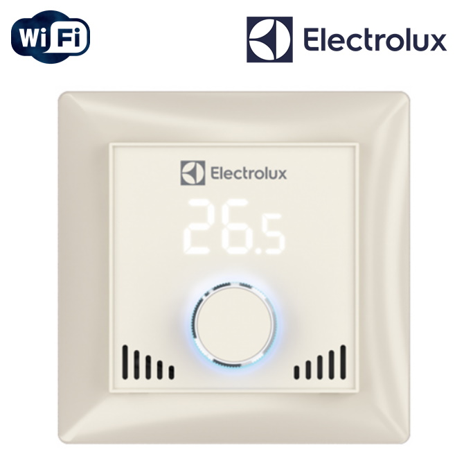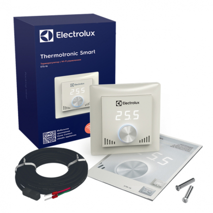 Терморегулятор Electrolux ETS-16 Smart (Electrolux Termotronic Smart) это инновационный программируемый терморегулятор с возможностью как механического управления, так и Wi-Fi управления через мобильное приложение Electrolux Home Comfort: climatic appliances (бесплатно в App Store и Play Market). Он оснащён встроенным датчиком температуры воздуха и имеет дополнительный выносной датчик температуры пола. Обладает широким спектром функций включая: блокировку дисплея для защиты от случайного нажатия, мониторинг и статистику энергопотребления в мобильном приложении, а также выбор сопротивления датчика температуры пола для быстрой замены терморегуляторов других производителей. Рабочий диапазон регулировки температуры от +5°C до +45°С. Максимальная нагрузка на устройство 16 А. Гарантийный срок эксплуатации составляет 5 лет.