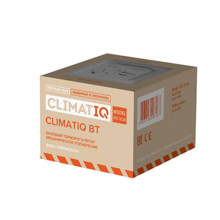 Терморегулятор CLIMATIQ BT white (белый) это устройство с механическим блоком управления, предназначенное для управления работой теплого пола. На лицевой части терморегулятора расположены включатель, круглый регулятор температуры со шкалой и светодиодный индикатор работы. Температурная шкала имеет градацию от + 10 °C до + 40 °C с делениями по 5 °C. В комплект терморегулятора входит датчик температуры пола на проводе длиной 3 метра, который необходимо устанавливать согласно инструкции. Максимальная нагрузка на устройство 16 А, что позволяет подключить к нему теплый пол с удельной мощностью до 3600 Вт.