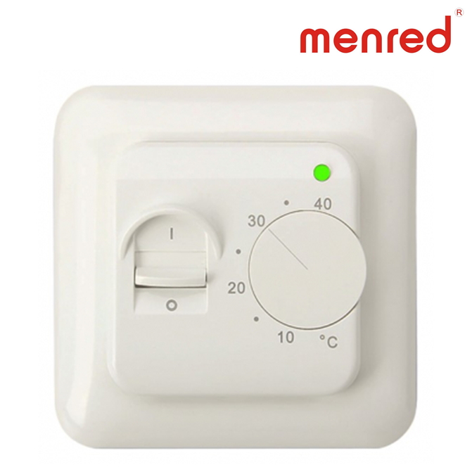 Терморегулятор Menred RTC 70.26 это механический терморегулятор, предназначен для управления системой подогрева пола. На лицевой части терморегулятора расположен тумблер включения, колесо механического переключения температуры и светодиодный индикатор, которые отражает работу системы обогрева. В комплект терморегулятора входит датчик температуры пола на проводе. Рабочий диапазон регулировки температуры от +5°C до +40°С. Максимальная нагрузка на устройство 16 А.