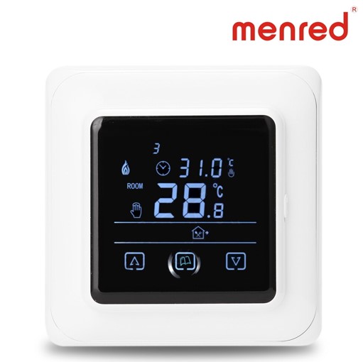 Терморегулятор Menred WARMLIFE BW это программируемый термостат с сенсорным жидкокристаллическим дисплеем, расположенным на лицевой панели. В комплект терморегулятора входит датчик температуры пола на проводе и встроенный датчик температуры воздуха. Рабочий диапазон регулировки температуры от +5°C до +40°С. Максимальная нагрузка на устройство 16 А. Терморегулятор имеет возможность программирования еженедельного цикла с 6-ю периодами на каждый день. Кроме того обладает функциями ограничения температуры пола, анти-замерзания, блокировки, настройки времени и выбор датчика, а также функцией «Отпуск» которая позволят заранее настроить расписание с фиксированной температурой в течение нескольких дней.