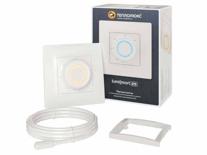 Терморегулятор LumiSmart 25 это цифровой термостат с механическим блоком управления. Он имеет встроенный датчик температуры воздуха, функции детекции открытого окна, неисправности датчика и самообучения. Отличается простотой визуального считывания состояния работы системы обогрева благодаря цветовой индикации режимов работы. Идеально встраивается в декоративные рамки Legrand Valena серии Basic, Chameleon, TOP, Class, Quadro и Schneider Electric серии Color; Metal; Schneider Electric Unica Pure.