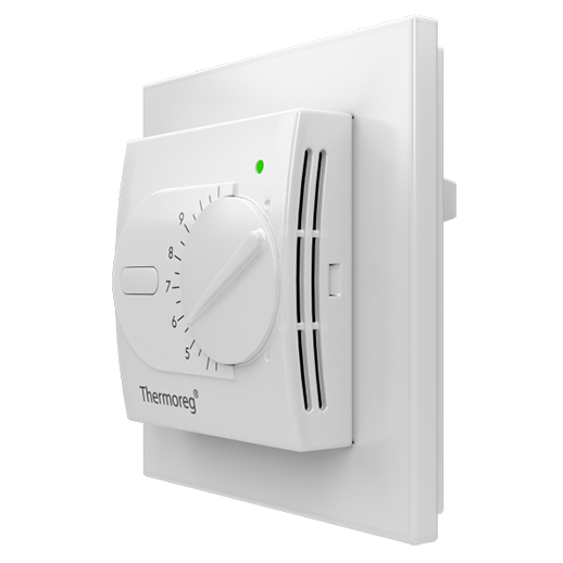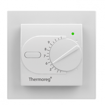 Терморегулятор Thermoreg TI-200 design это электрическое устройство, с механическим регулятором температур, которое предназначено для управления электрическими системами обогрева. Терморегулятор Thermoreg TI-200 имеет стандартные размеры для монтажа во встраиваемую коробку. На лицевой части терморегулятора расположены кнопка включения, колесо механического переключения температуры и светодиодный индикатор, которые отражает работу системы обогрева (красный индикатор - указаывает подачу питания на нагревательный кабель, зеленый - нет питания нагревательного кабеля, мигающий красный - выход из строя полового датчика.