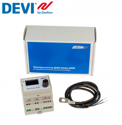Система с терморегулятором ДЕВИ Meteo 850R включает в себя терморегулятор с датчиком температуры воздуха в комплекте и датчик кровли ДЕВИ Roof 850R. Устанавливается в помещениях на профиль DIN.