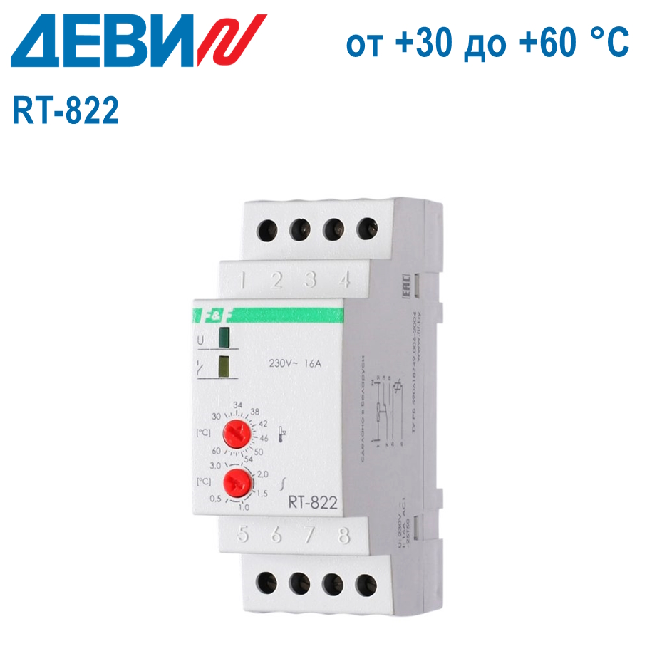 Терморегулятор Деви RT-822 относится к электронным устройствам с диапазоном регулирования температуры от + 30 до + 60 °C, который применяется для поддержания высокой температуры воды и других жидкостей в технологических трубопроводах и резервуарах; обогрев лежаков в хаммамах. Устанавливается в щиток на профиль DIN. Терморегулятор работает в одном из двух режимов: «Обогрев» или «Охлаждение»: