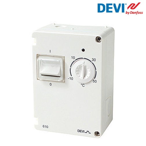 Термостат DEVIreg™ 610 ( артикул 140F1080 ) представляет собой электронный терморегулятор, предназначенный для установки внутри помещения, на наружную стену здания или хомутом на трубу. Его сфера применения включает в себя управление системами кондиционирования, подогрева труб, емкостей, защиты от обледенения, обогрева помещений и комфортного подогрева полов. Устройство оборудовано 2-х полюсным выключателем и проводным датчиком для регулировки температуры. Также терморегулятор снабжен ручкой для регулировки температуры, со шкалой от -10 до +50°C и светодиодным индикатором, отображающим режим работы красный цветом, а режим ожидания зеленым цветом. Такая модель терморегулятора имеет герметичный корпус с защитой от влаги и пыли соответствующей стандарту IP44.