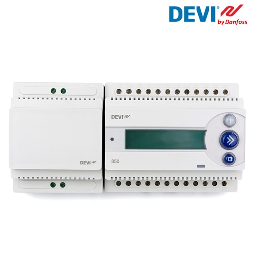 Система с терморегулятором DEVIreg 850 включает в себя терморегулятор, источник питания, датчики влажности и температуры для кровли или для грунта. Устанавливается в помещениях на профиль DIN.